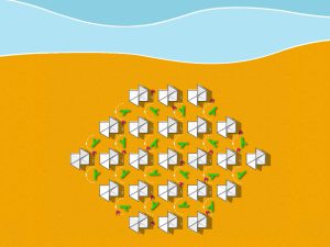 Il sistema prevede di disporre sull’arenile una griglia geometrica composta da una composizione di esagoni, i quali definiscono aree dove disporre gli ombrelloni o dei gazebi ad hoc, sotto cui possono sostare i bagnanti, intervallate da ambiti destinati al passaggio in sicurezza, in cui posizionare delle piante autoctone che garantiscono la distanza, mentre due persone percorrono in senso opposto l’area circolare.