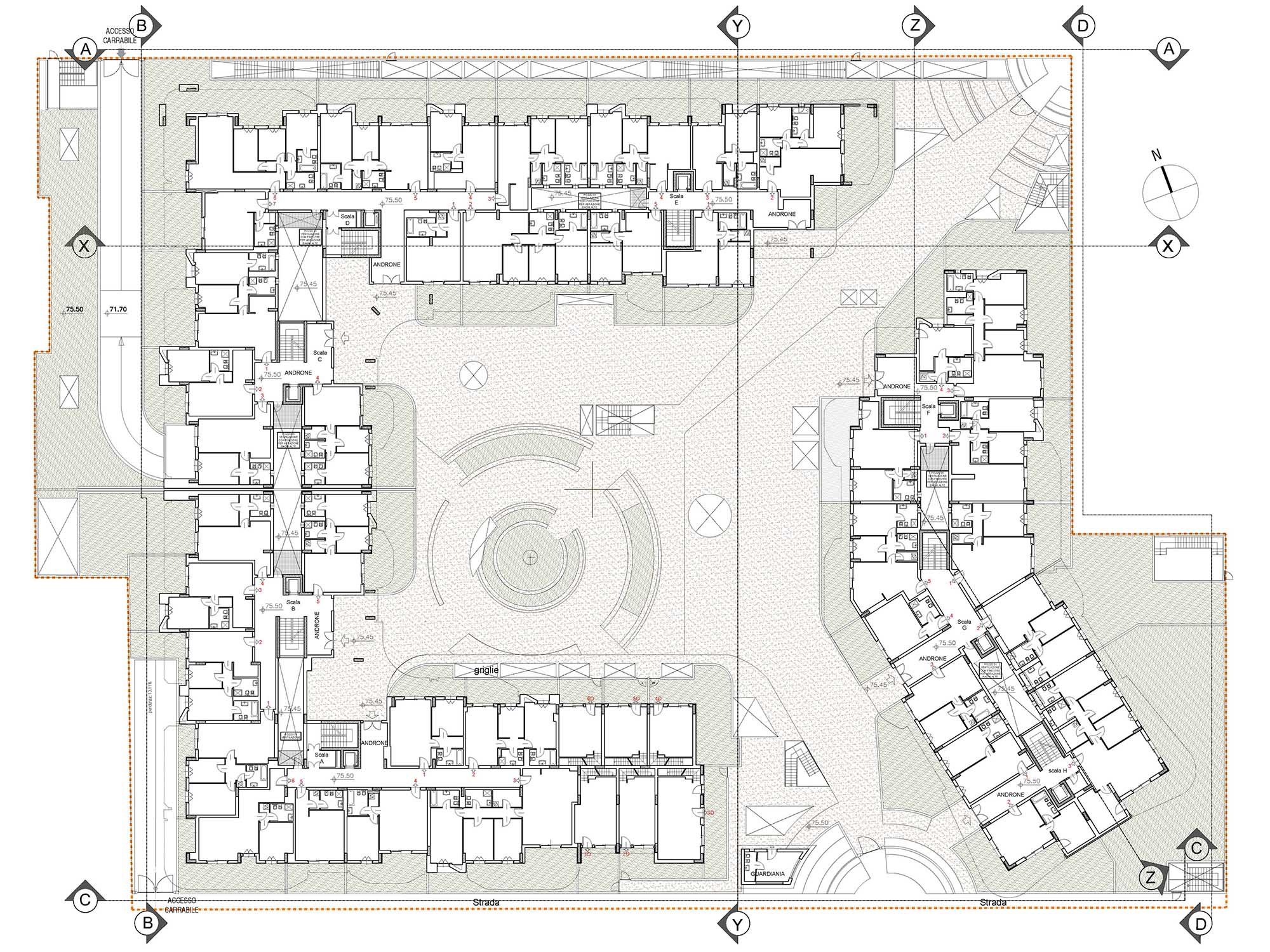 Per gli edifici privati, il progetto architettonico e di paesaggio si è confrontato con i valori del contesto, con l’utilizzo di paramenti a cortina, che non stridono e non entrano in competizione formale con quelli del “Buon Pastore”.